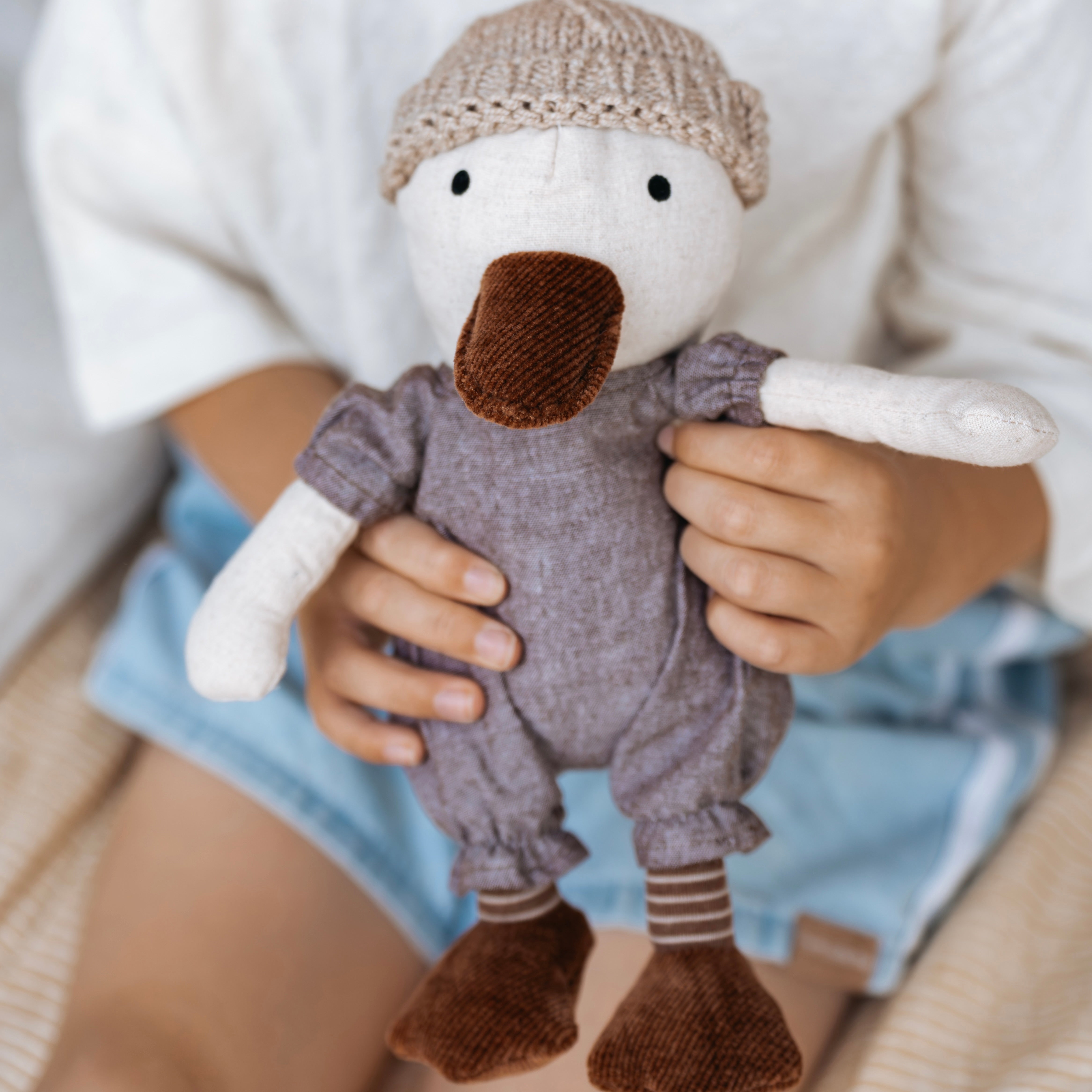 Floyd Duck is made from natural linen cotton and wears classic brown linen overalls, and biscuit-coloured knitted hat made from Australian merino wool. Paired with brown and cream striped stockings, Floyd is designed for play, cuddles and adventures.