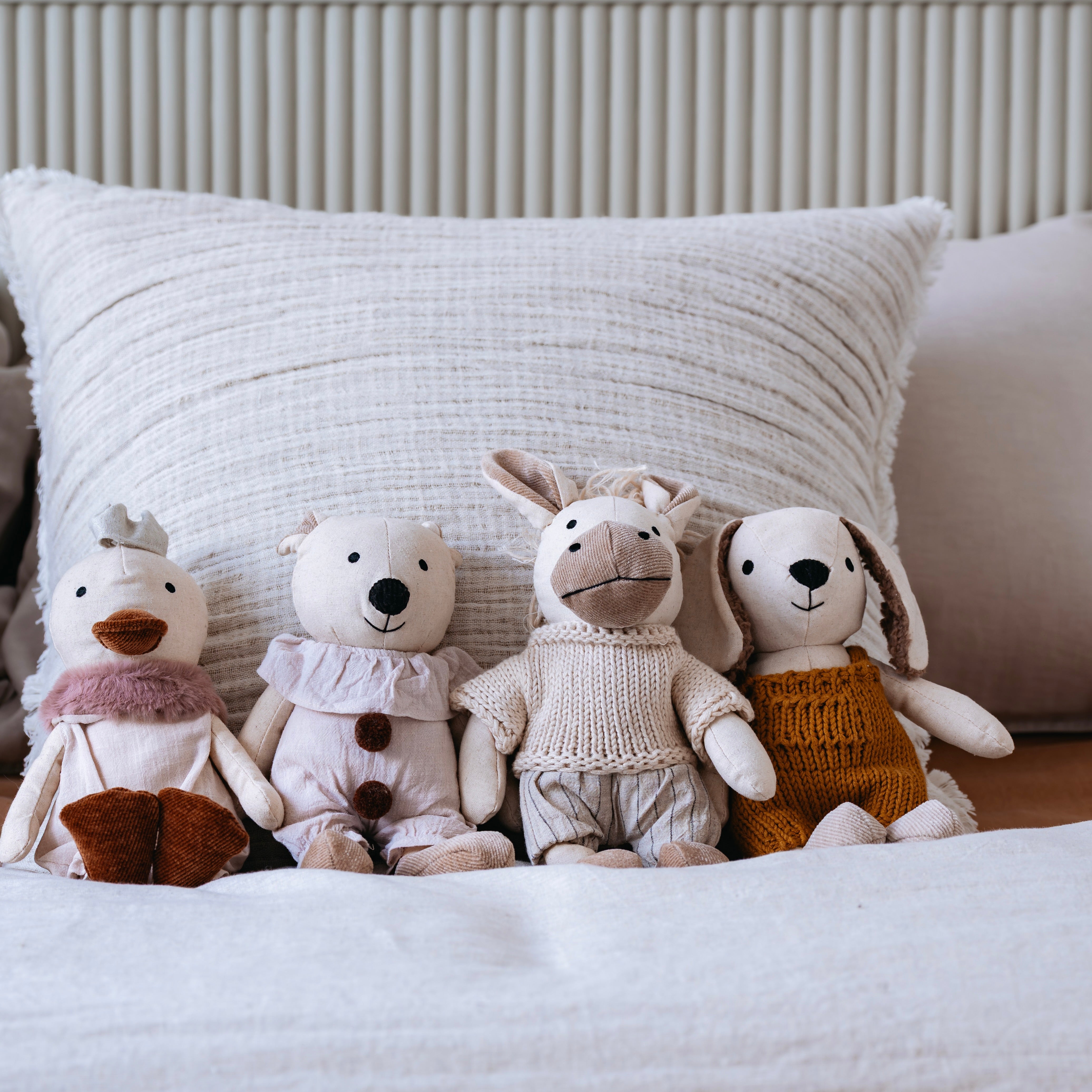 Gilbert Dog is made from natural linen cotton, with soft, tactile cotton plush ears that are perfect for cuddles. He wears mustard Australian merino wool knitted overalls.