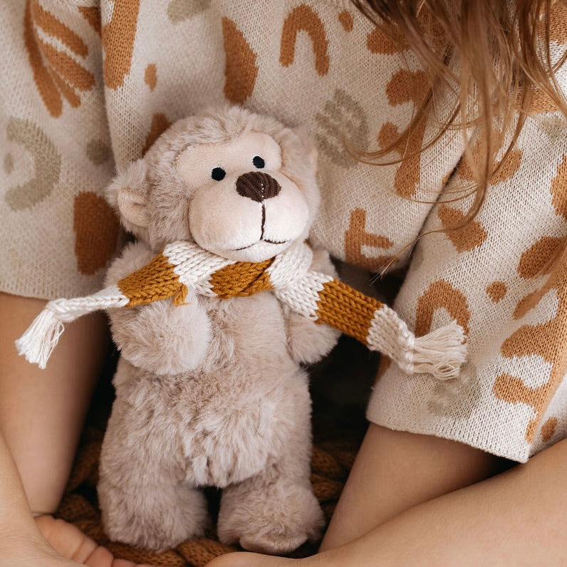 Hugo Monkey is made from soft caramel-coloured plush and wears a cosy Australian merino wool striped scarf to keep him snug. He’s wonderfully cuddly and always ready for a big hug.