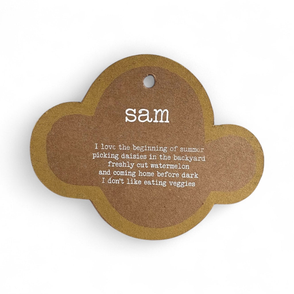 Sam the knitted monkey made with love from 100% cotton and filled with recycled polyester fibre. He's super soft and loves to play in the mud, build train sets, and make his sister mad.